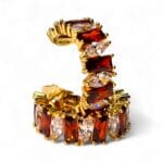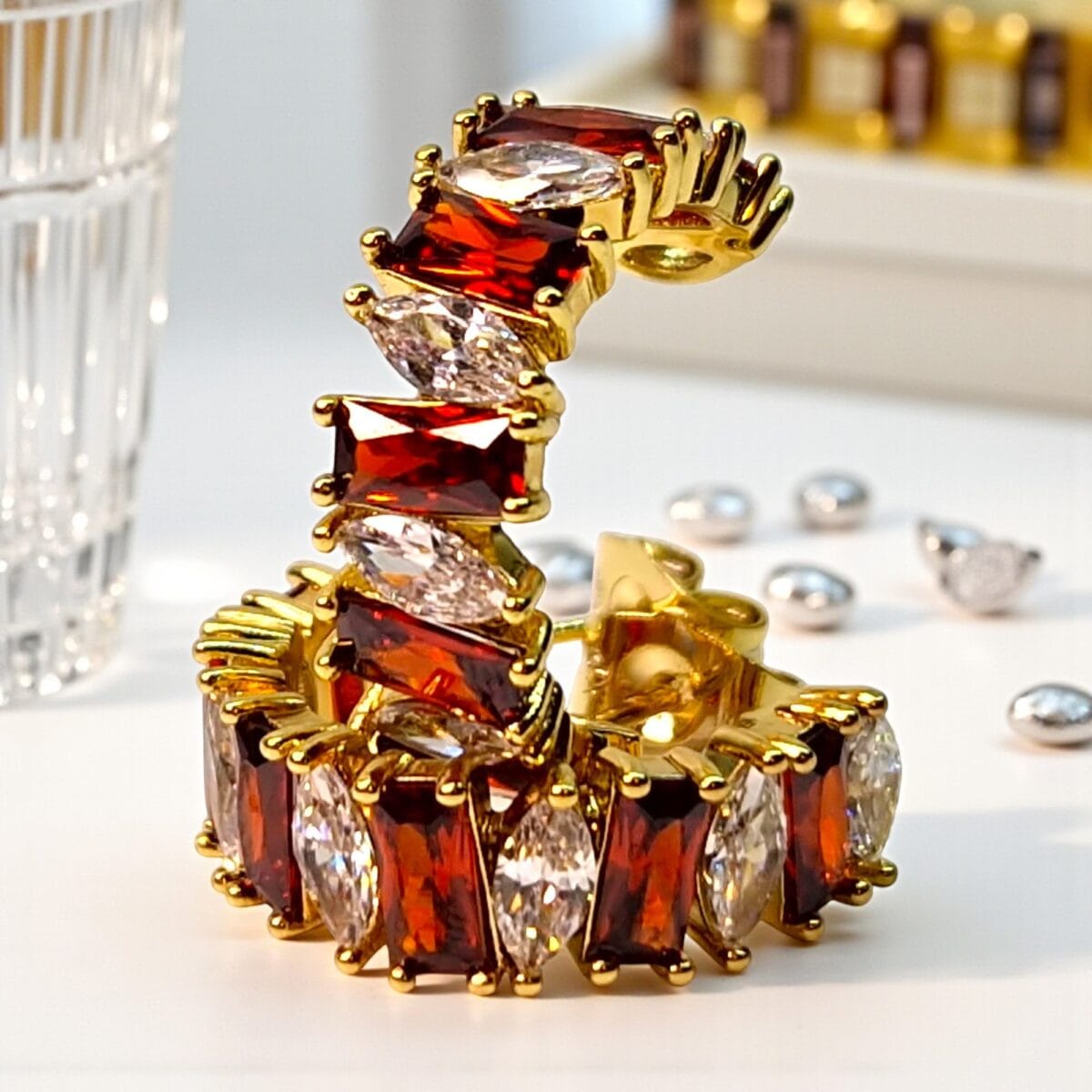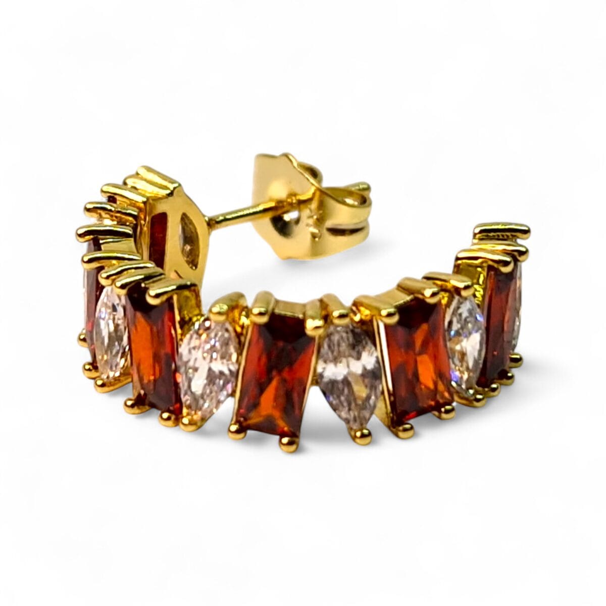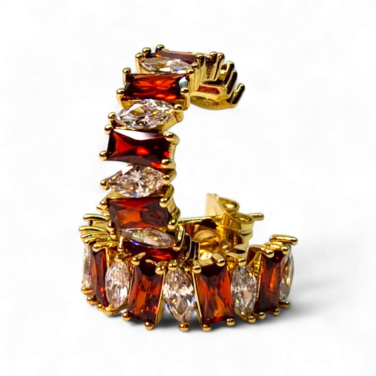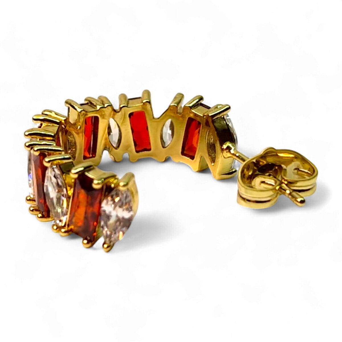 Realizați din oțel inoxidabil de calitate superioară și placați cu aur 14K, cerceii Andreea impresionează prin combinația unică de culori și forme. Fiecare cristal roșu este alternat cu pietre albe din zirconiu, tăiate în forme marquise și baguette, pentru o reflexie spectaculoasă a luminii.
